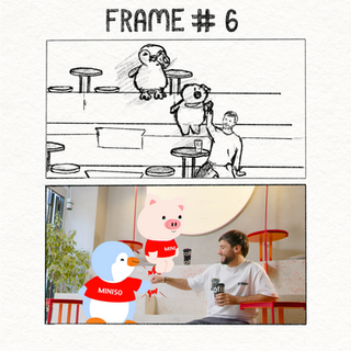 The project kicked off with a detailed storyboard to outline the journey from a regular coffee shop visit to a whimsical animated interaction. Each scene was planned to balance real-world footage with character animations, focusing on smooth transitions and harmonious composition. From the customer entering Cofix to sharing animated moments with the Miniso characters, every sequence was carefully visualized to achieve a seamless integration of live-action and animation.